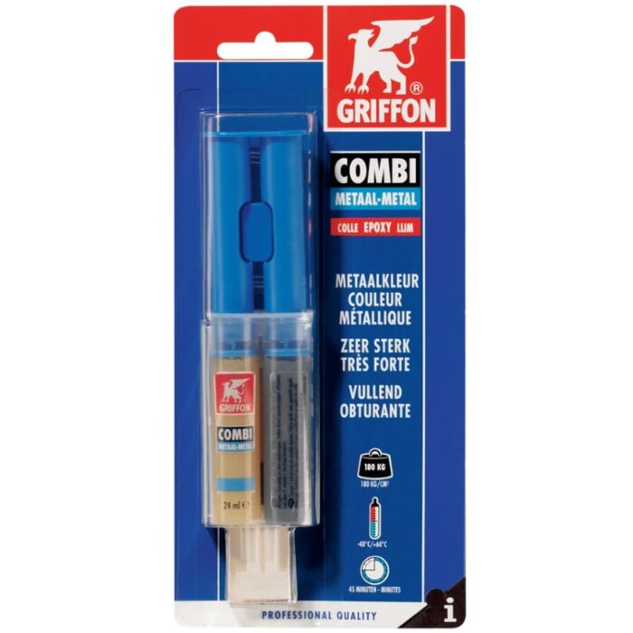 Griffon Kombi Metaal metaalkleurige 2-componenten epoxylijm geleverd in een dubbelspuit met inhoud 24 ml. Deze ijzersterke en metaalkleurige 2-componenten epoxylijm is ideaal voor ijzersterke reparaties aan voorwerpen van metaal die bestand moeten zijn tegen extreme omstandigheden (krachten, trillingen, (zee)water, zware belasting), zoals gereedschap, onderdelen van auto, motor, (brom)fiets, metalen (tuin)hekken of bestek. Tevens is deze 2 componentenlijm geschikt voor het afdichten van een klein gaatje in de radiator.