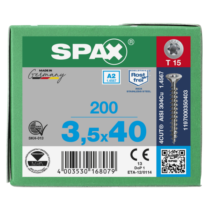 Spax spaanplaatschroeven T15 RVS A2 3.5 x 40 mm mm voldraad 200 stuks